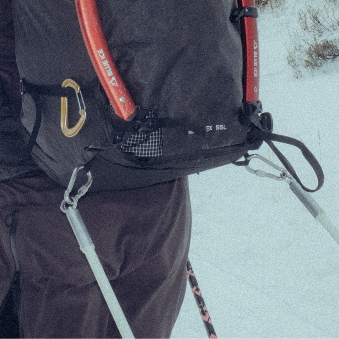 The ice tool carry keeps the picks of your tools fully enclosed and secure so they don't get snagged or fall out. The ice tool carry is designed so that you can pull an axe out without taking your pack off.
