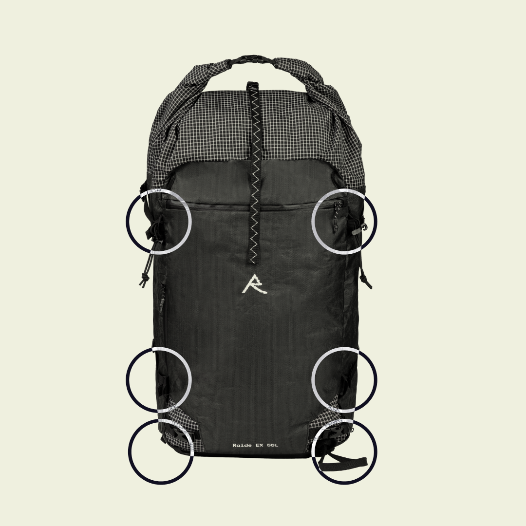 Equipped with eight lashing points for attaching accessories such as a helmet, sled, foam sleeping pad, etc.