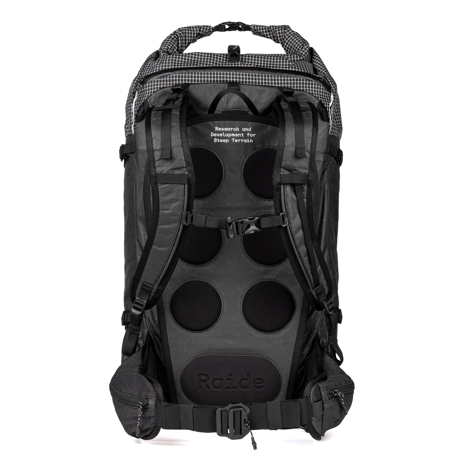Raide packs are designed to carry skis in four different ways: diagonal ski, skimo, a-frame, and vertical snowboard.
