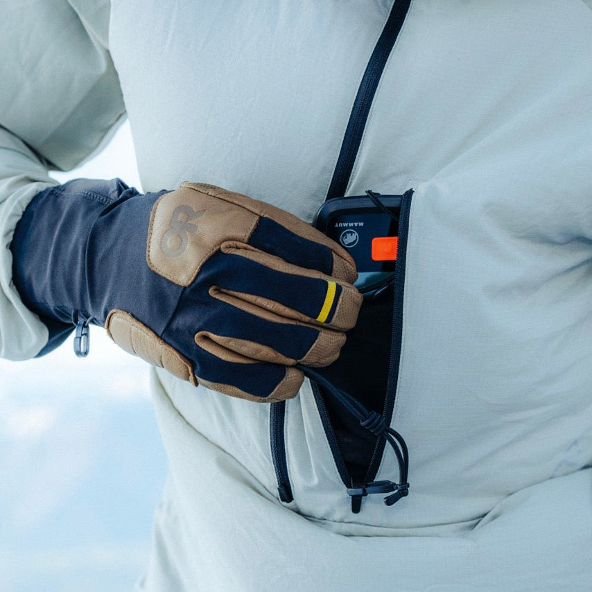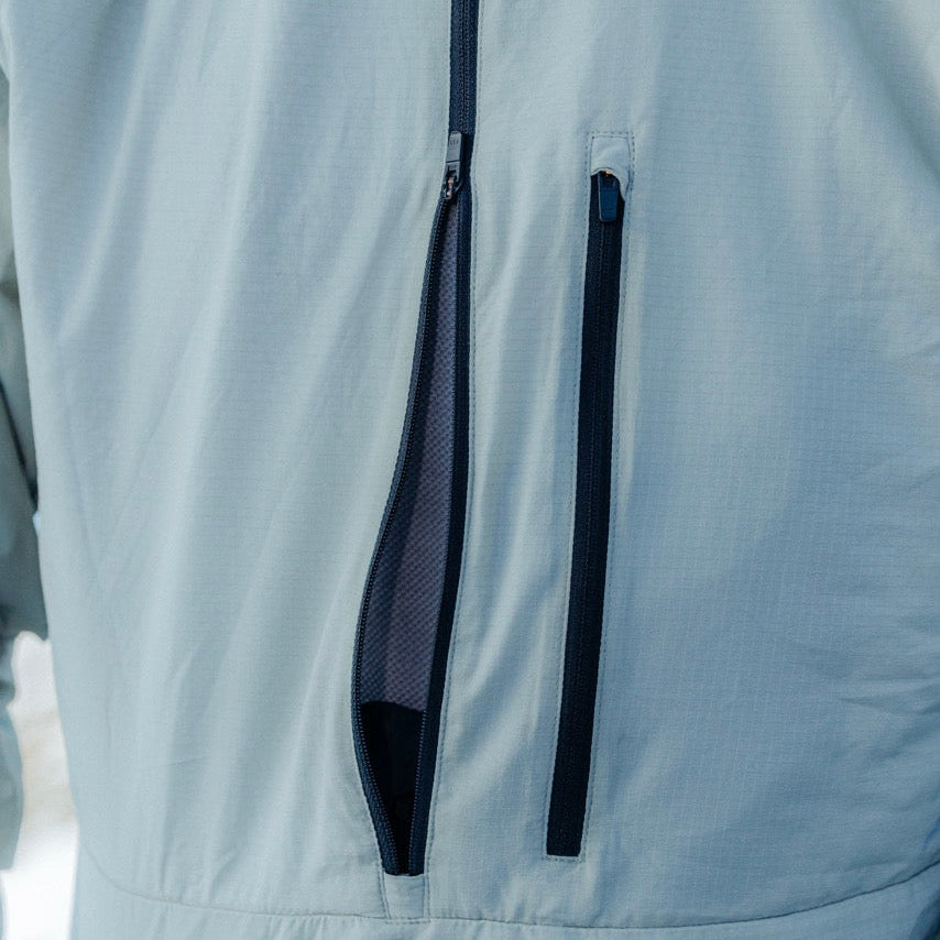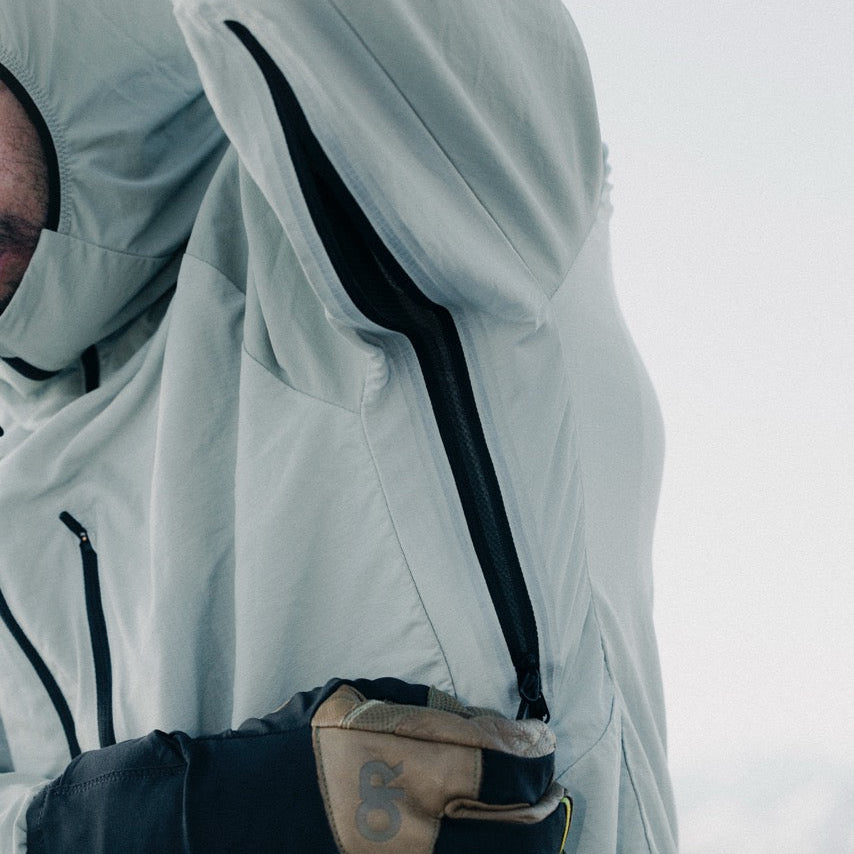 An internal elastic sleeve and webbing loop inside the chest pocket let you securely hold your beacon, phone, or other essentials. The pocket aligns perfectly with the pass-through pocket on the TourTech Shell for quick access. The beacon pocket is also where the hybrid hoodie packs itself into for the most compressed carry in your pack.