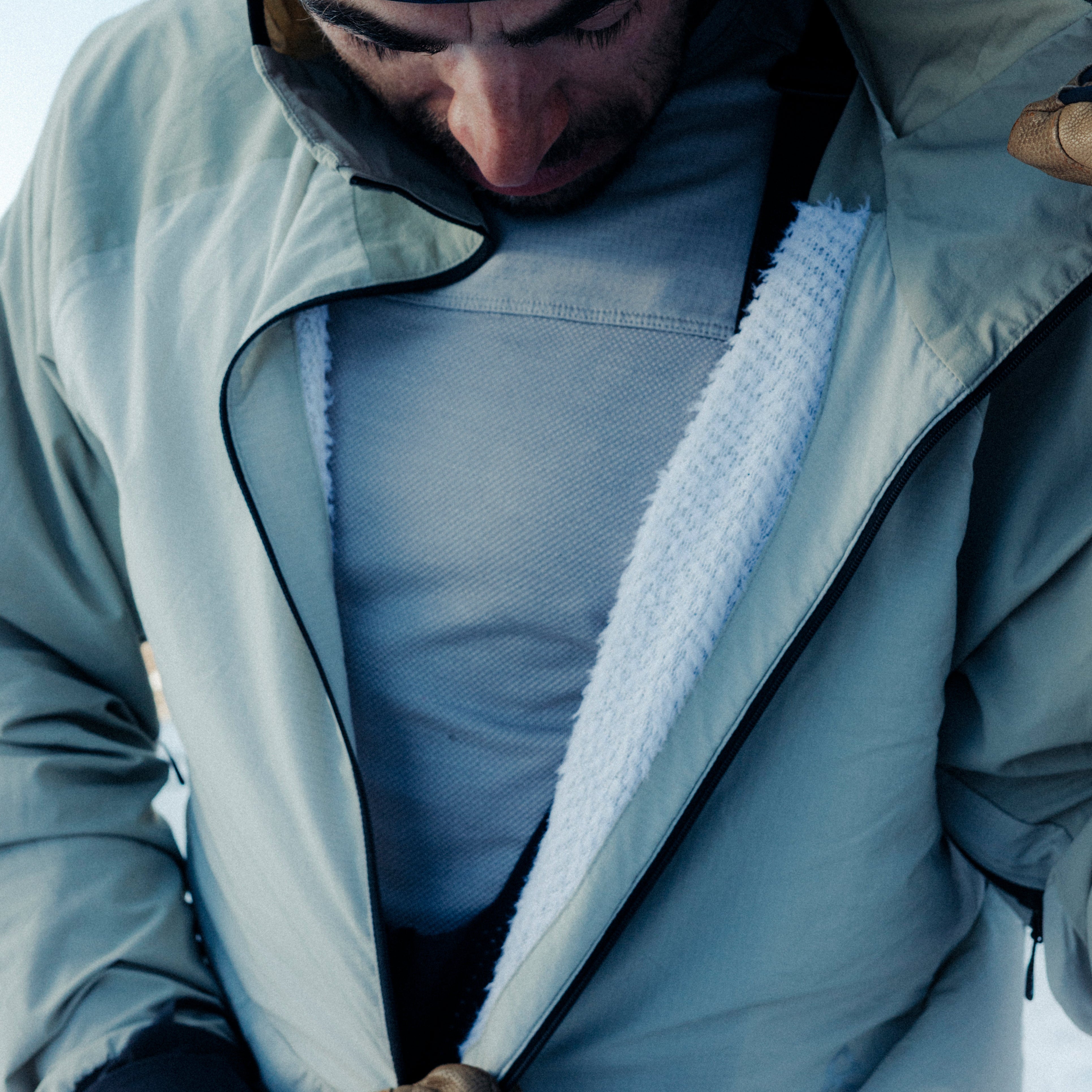 We couldn’t find a midlayer we wanted to keep on all day, so we built one. The TourTech Hybrid Hoodie is designed specifically for ski touring, with insulation only where you need it and none where you don’t. A single insulated panel across the chest provides targeted warmth, while the rest of the hoodie stays uninsulated for maximum breathability under a pack or shell. It’s the layer you’ll start and finish every tour in, no matter the conditions.